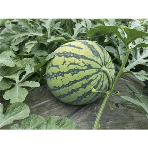 新育成的早熟、优质杂交一代西瓜品种。全生育期89天左右,雌花开放至果实成熟30天左右,果实圆形,果皮浅绿色覆盖有墨绿条纹,有蜡粉,植株长势中等稳健,坐果性好,丰产性强。单瓜重一般6kg 左右,最大可达8kg左右,皮薄,瓤色桃红,肉质脆嫩,中心可溶性固形物含量12%左右,品质佳,抗性强,耐储运,是高品质的优良西瓜品种。
