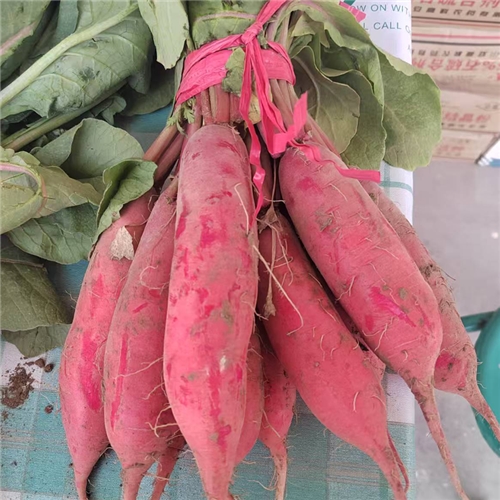 板叶型新品种春红水萝卜,冬性较强,叶丛半直立,深绿色。根圆柱形,根长15cm左右,根粗4cm 左右,平均单根重130g左右。皮色全红,表皮光滑美观,商品性好。肉质细密,含水量适中,品质优良,生食无辣味,稍有甜味,生长速度快,丰产性好。露地栽培从播种至收获40~45 天。耐糠心,可适时延期采收7~10天。
